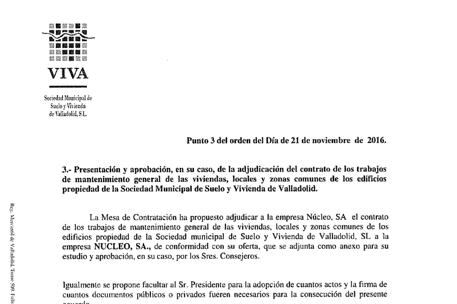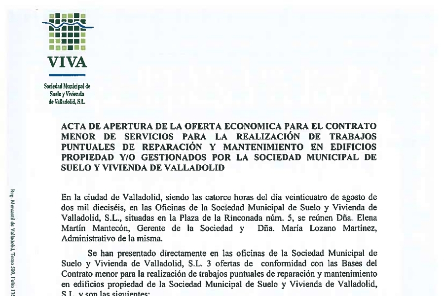 • ADJUDICACIÓN DE LOS TRABAJOS DE MANTENIMIENTO GENERAL DE LAS VIVIENDAS, LOCALES Y ZONAS COMUNES DE LOS EDIFICIOS PROPIEDAD DE LA SOCIEDAD MUNICIPAL DE SUELO Y VIVIENDA DE VALLADOLID, S.L.