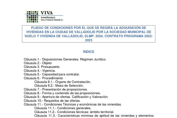 El objeto del contrato al que se refiere el presente pliego es la adquisición por parte de VIVA del pleno dominio de viviendas situadas en el término municipal de Valladolid, libre de cargas y gravámenes, arrendatarios, ocupantes y precaristas, con la finalidad de ampliar el Parque Público de Vivienda en Alquiler para asignar a los diversos programas vigentes o de nueva creación de viviendas de VIVA y/o en el marco de los diversos convenios que VIVA pueda suscribir con terceros.