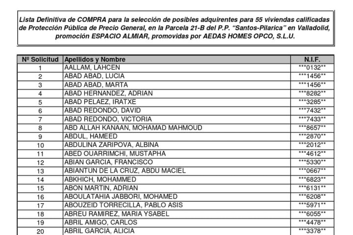 OBJETO: selección de posibles adquirentes para 55 viviendas calificadas de Protección Pública de Precio General, en la promoción ESPACIO ALMIAR en Valladolid, promovidas por AEDAS HOMES OPCO, S.L.U