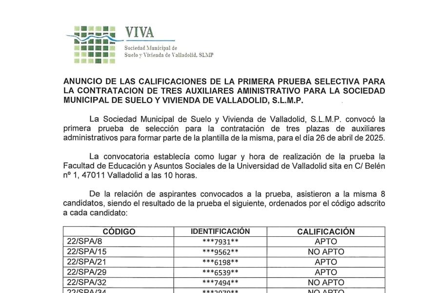 07/05/2025Anuncio de las calificaciones de la 1ª prueba selectiva para la contratación de 3 auxiliares administrativos para VIVA.