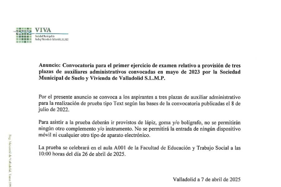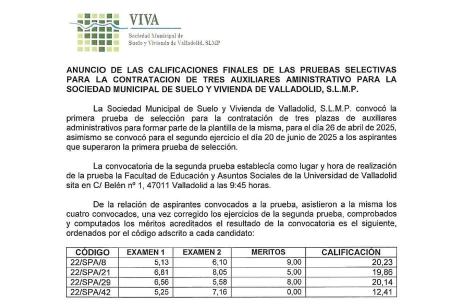 01/07/2025Anuncio de las calificaciones finales de las pruebas selectivas para la contratación de tres auxiliares administrativos para la Sociedad Municipal de Suelo y Vivienda de Valladolid, SLMP