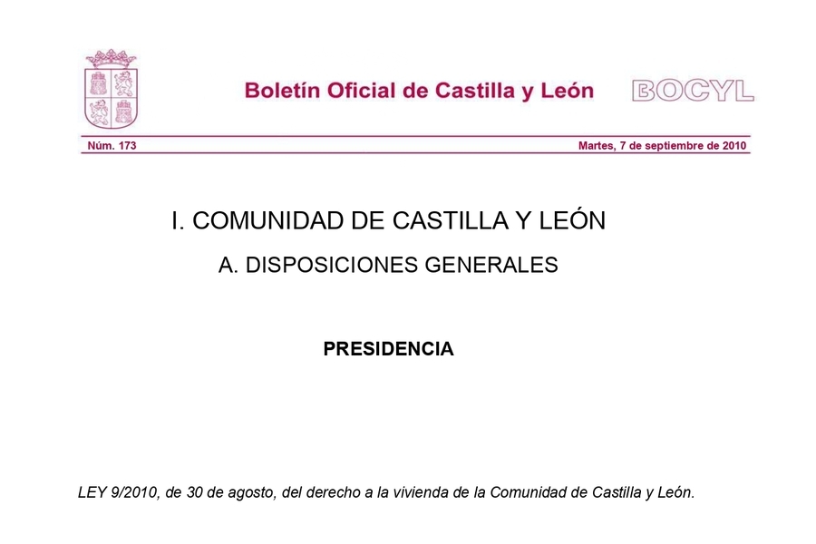 • Ley 9/2010, de 30 de agosto, del Derecho a la Vivienda de la Comunidad de Castilla y León.
