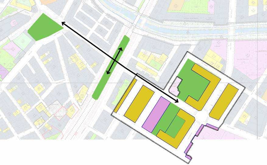 - Plano de cómo quedará la zona tras la reforma. En amarillo las viviendas protegidas, en morado el suelo dotacional y las nuevas zonas verdes.