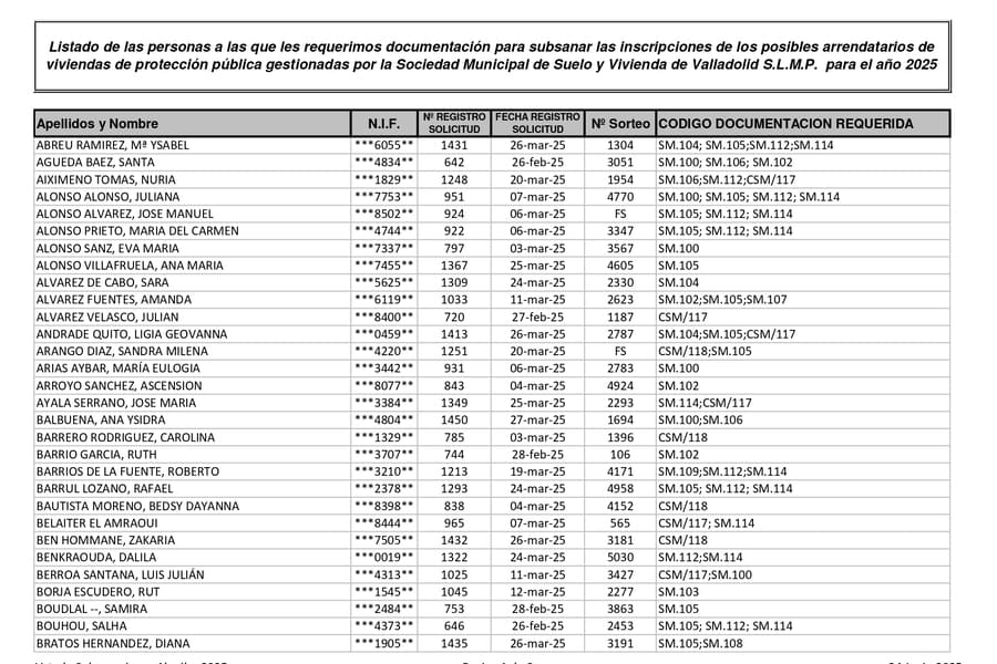 02/01/2026Listados de los diferentes programas de arrendatarios de las viviendas incluidas en el ámbito de aplicación del Protocolo de Acceso a la Vivienda en Alquiler Municipal gestionado por la Sociedad Municipal de Suelo y Vivienda de Valladolid, S.L.M.P., para el año 2025.
