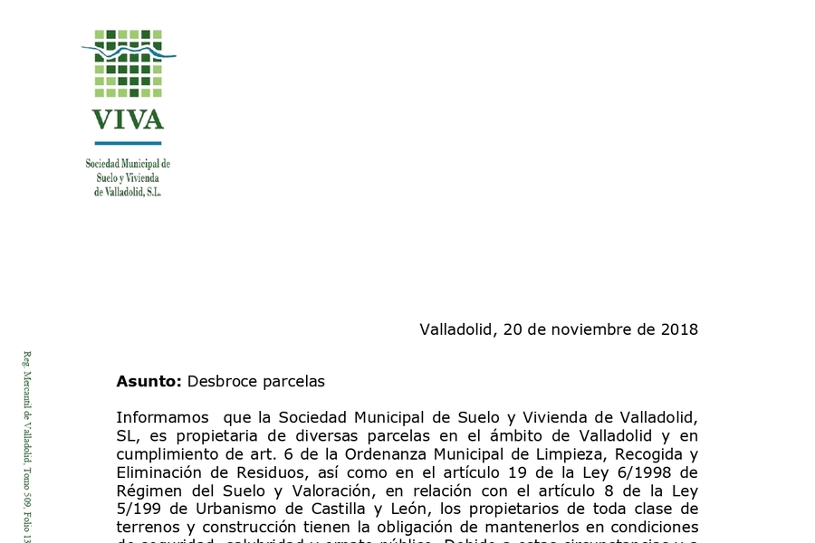 • ADJUDICACIÓN DEL DESBROCE, LIMPIEZA Y RETIRADA DEL MATERIAL SOBRANTE DE LAS PARCELAS DE LA SOCIEDAD MUNICIPAL DE SUELO Y VIVIENDA DE VALLADOLID, S.L.