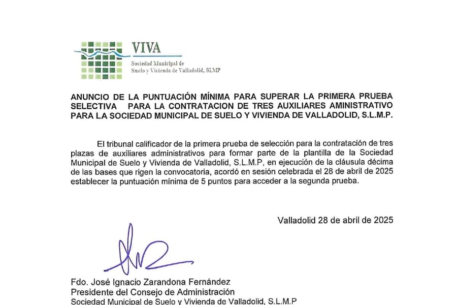 06/05/2025Anuncio de la puntuación mínima para superar la 1ª prueba selectiva para la contratación de 3 auxiliares administrativos para VIVA