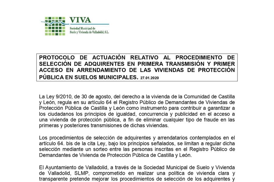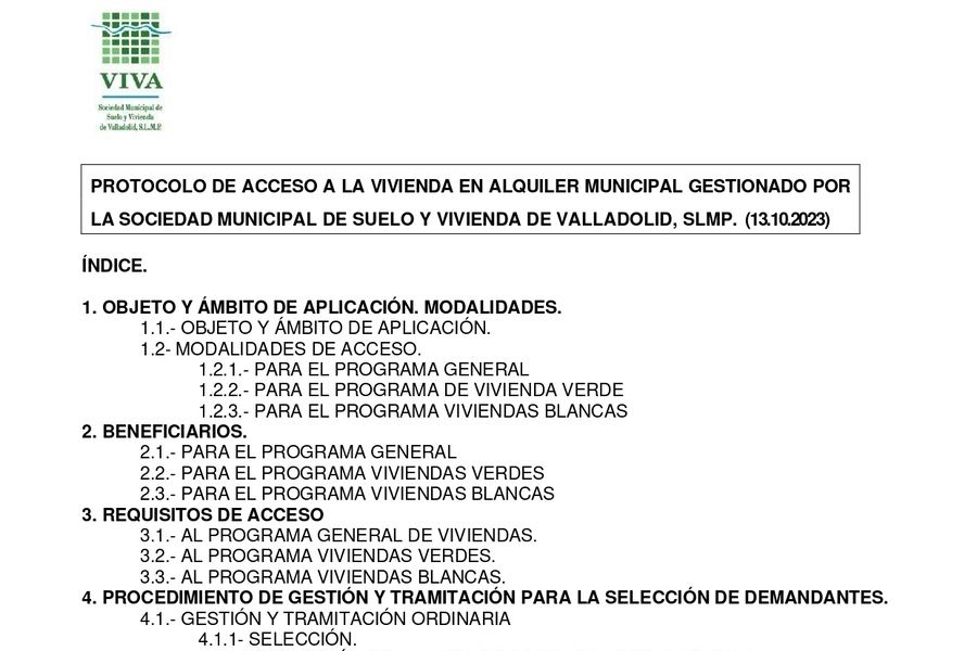 • PROTOCOLO DE ACCESO A LA VIVIENDA EN ALQUILER MUNICIPAL GESTIONADO POR LA SOCIEDAD MUNICIPAL DE SUELO Y VIVIENDA DE VALLADOLID, SLMP. (13/10/2023)